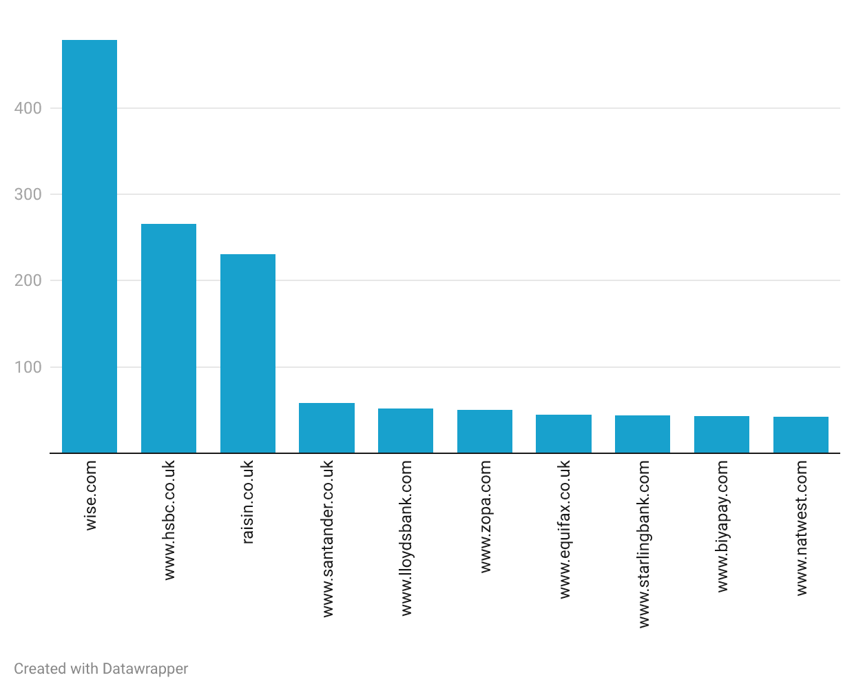 Banking is the sub-topic where brand sites have the highest share of citations at 16%. Wise leads with 496 citations, followed by HSBC at 266 and Raisin at 231.