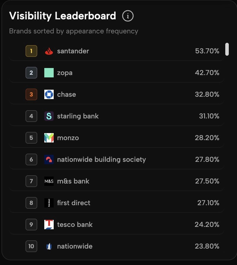 Zopa, Chase, Starling and Monzo, all challengers in the UK and all outside of the top 5 most cited banking brands, occupy 4 of the 5 top spots in the visibility leaderboard for our banking topic. Zopa, appearing at position 2 on visibility and position 6 on citation source (and an Obsero customer!) arguably winning the AI Search race in this topic.