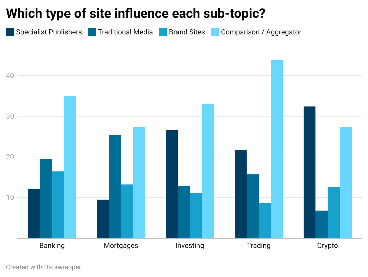 In a sector where products are commoditised, price sensitivity is high and where sky-high affiliate CPAs have resulted in a plethora of listicles, it's perhaps unsurprising to see comparison and aggregator sites dominate the finance citation list. Across the five finance sub-topics, comparison and aggregator sites accounted for: