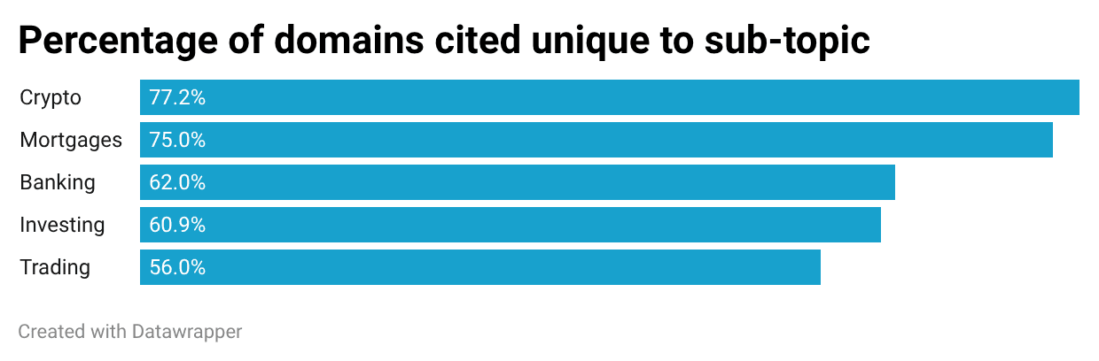 And crypto had the most unique citation sources of any sub-topic, with 376 domains appearing only in crypto and nowhere else in finance — 77% of all crypto domains. This is a genuinely distinct ecosystem.