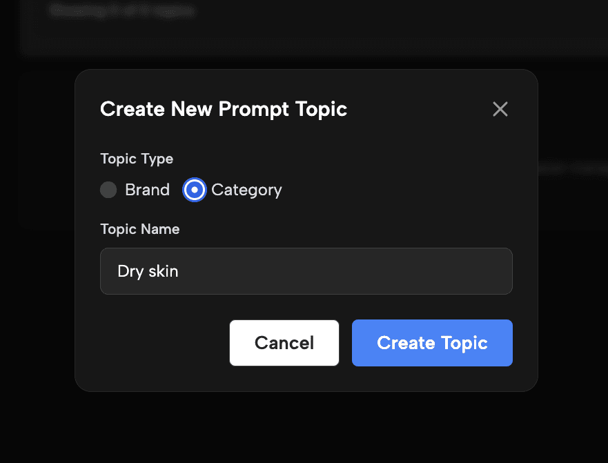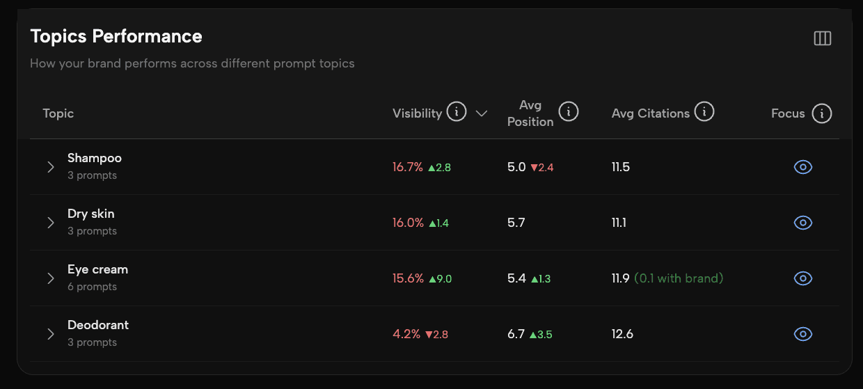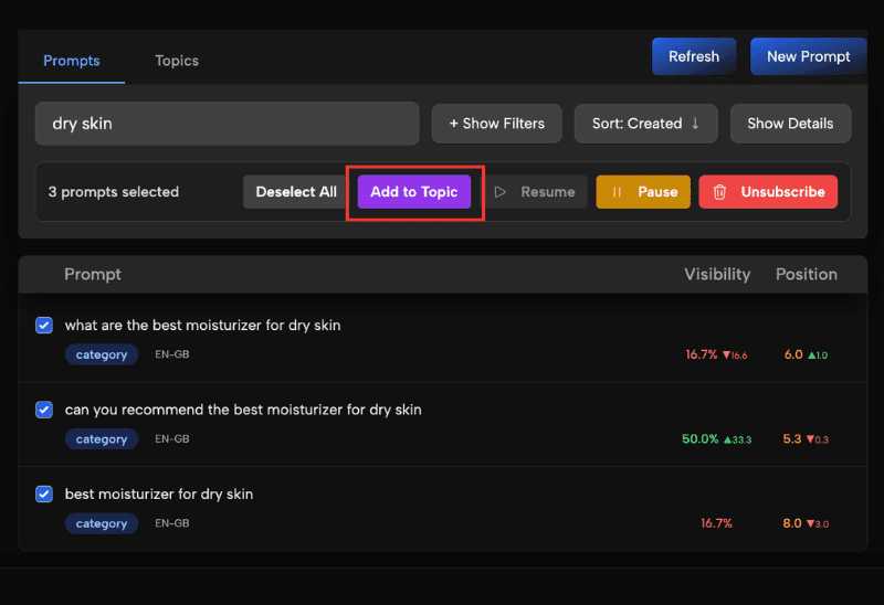 Topics allow you to group your prompts into meaningful segments, giving you a clearer picture of how your brand is performing across the areas that matter most to your business. For example, a brand like Boots might segment prompts into categories like dry skin, shampoo, deodorant, and so on.