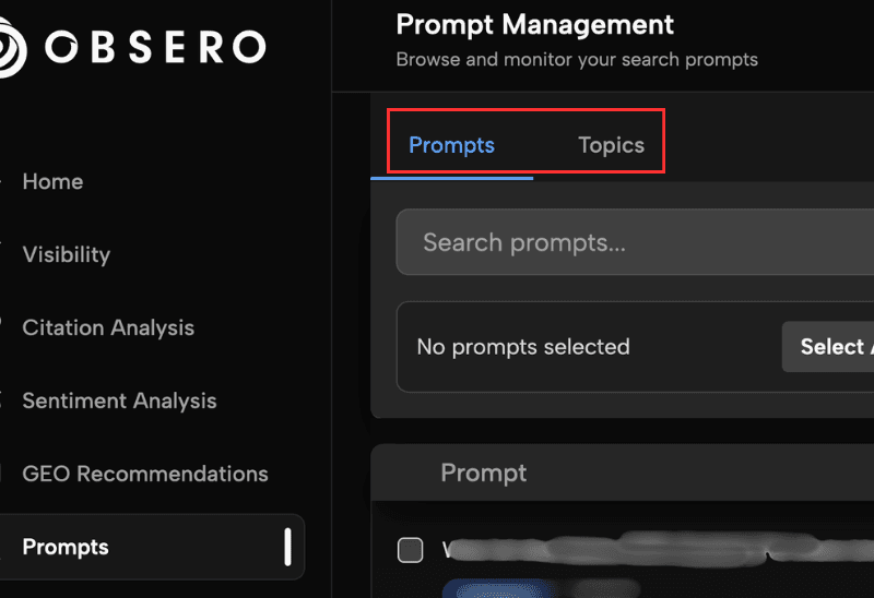 We recommend adding as many relevant prompts as possible to each topic. A higher prompt count gives you more comprehensive coverage and more reliable insight into how your brand is performing within each segment. The number of prompts available to you will depend on your Obsero package