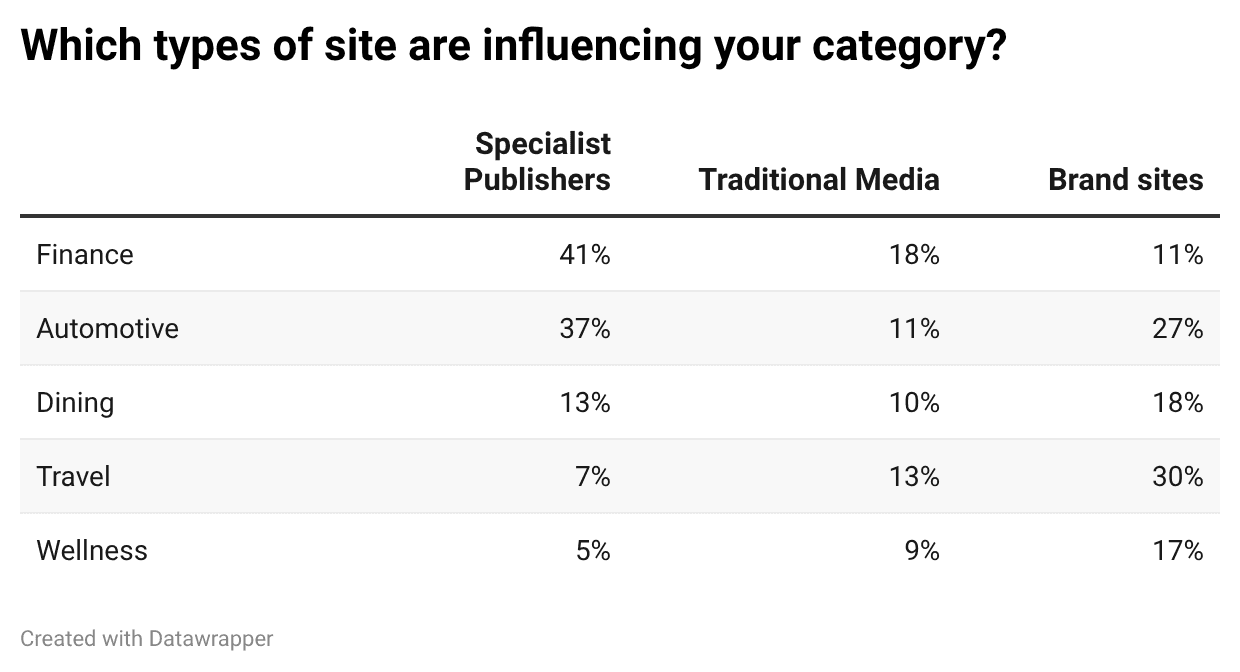 For finance and automotive prompts, circa 40% of all citations were from specialist publications such as NerdWallet for finance or Auto Express for automotive