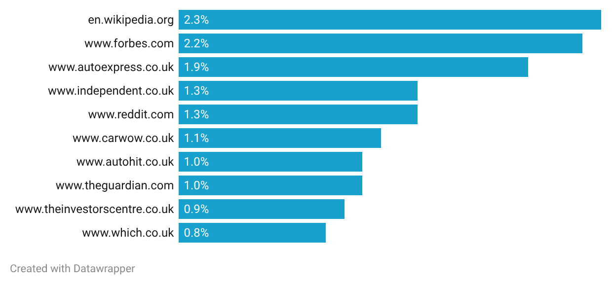 Despite this, the top 10 most cited domains for the prompts we tracked read like a who's who of Tier 1 media, UGC and comparison or review sites. Wikipedia accounts for 2.3% of all citations, with category-specific media such as Forbes and Auto Express not far behind.