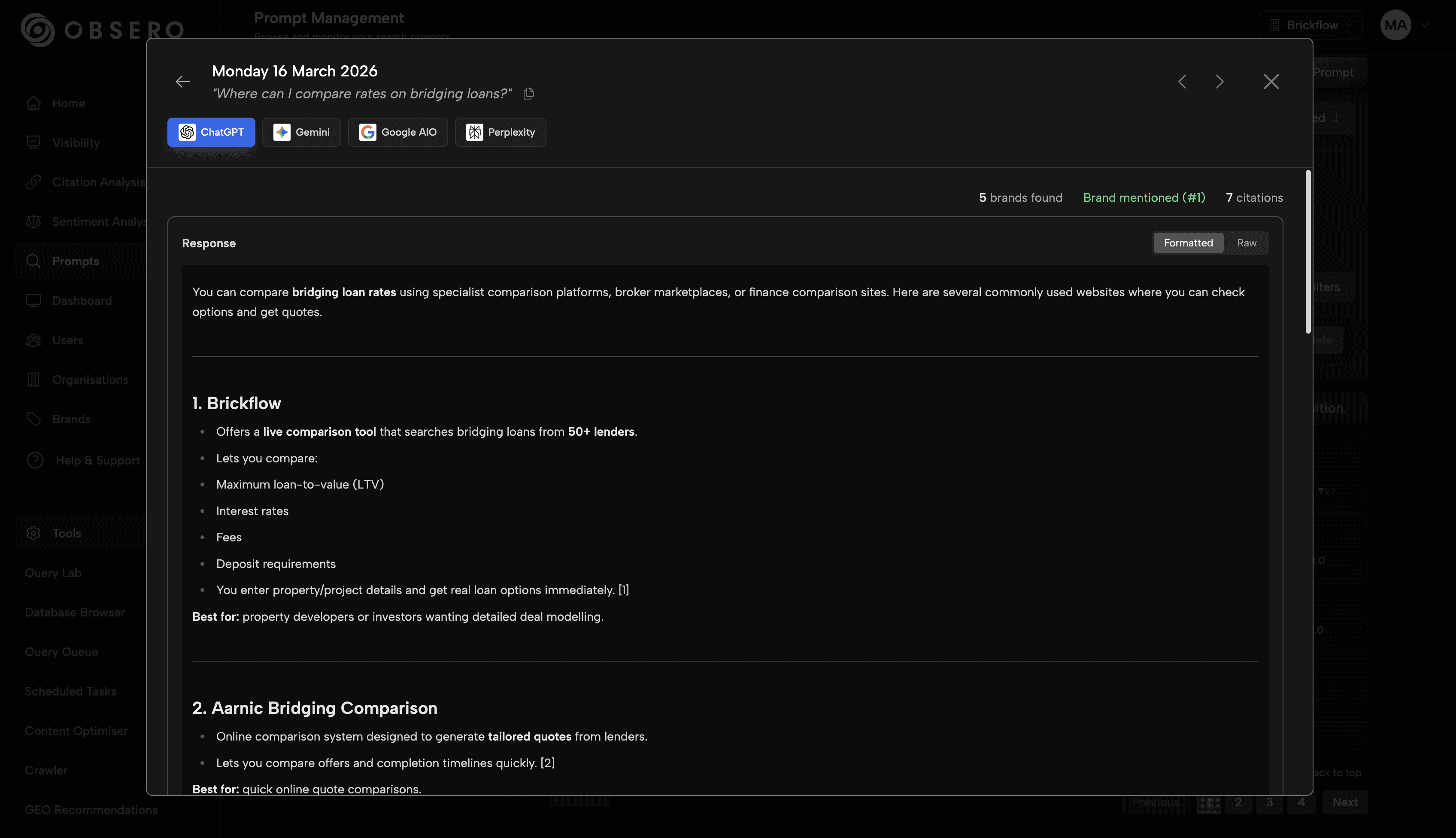 Obsero's prompt analytics log every AI response to every tracked prompt, across platforms, over time. See the full answer, filter by brand mention, position and LLM. No black boxes.